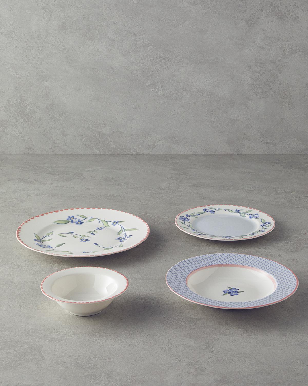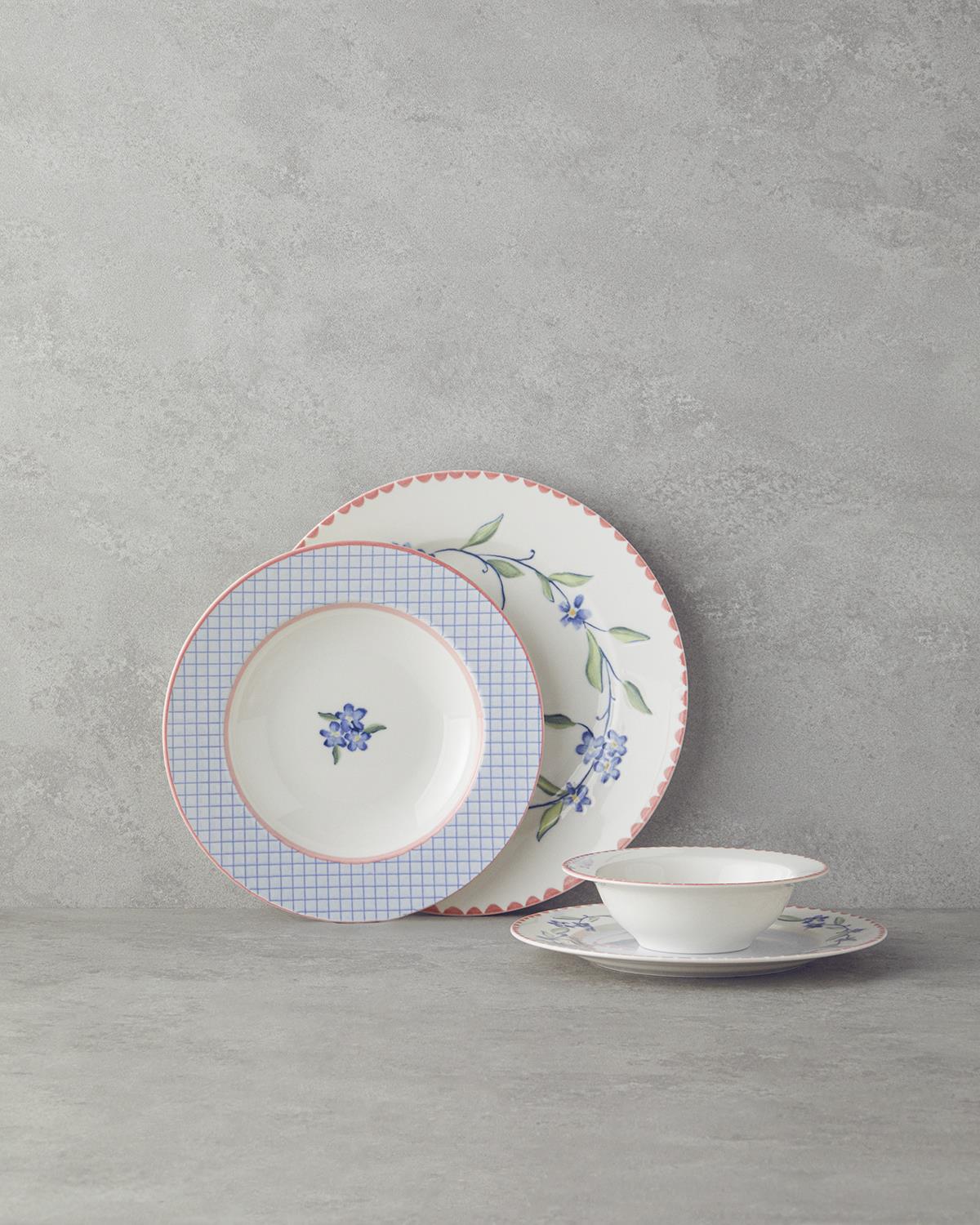 Yuvarlak porselen yemek takımı olan Dreamland, hem şık sunumlar yapmanıza olanak tanır hem de porselenin sağlam yapısıyla günlük kullanım için uygun bir seçenektir. Mavi çiçek motifleri ve pembe geometrik desenler, sofralarınıza canlılık ve şıklık katar.