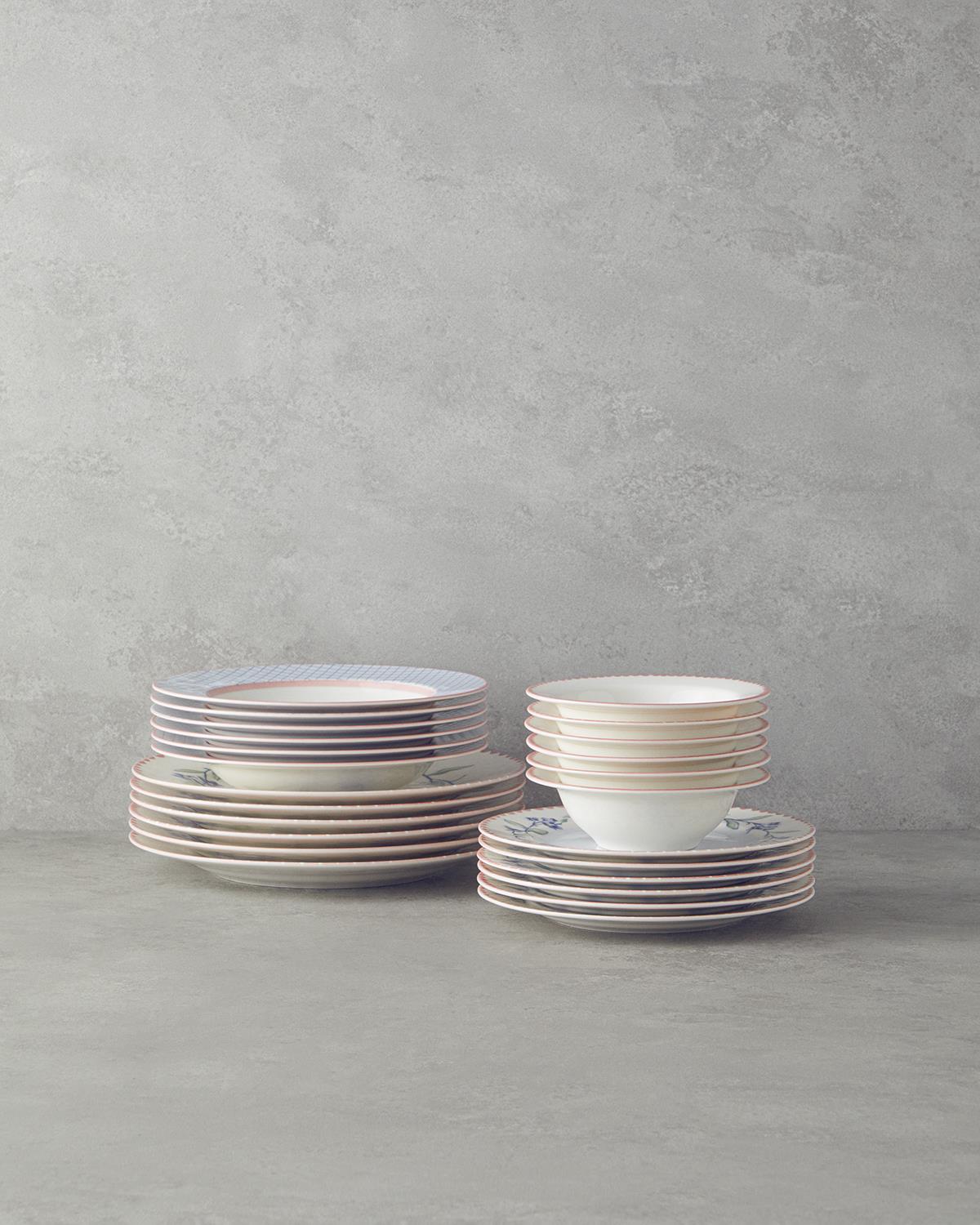 Bu takımın en dikkat çekici özelliği, mavi ve pembe tonlarında zarif desenlerle süslenmiş olmasıdır. Tabakların kenarlarında yer alan pembe desenli şeritler, iç kısımlarda ise mavi çiçek motifleri bulunur. Tabakların bazılarında ise mavi zemin üzerine pembe çizgili kare desenler dikkat çeker. Bu detaylar, sofralarınıza hem renk hem de zarif bir dokunuş katar. English Home yemek takımı olarak tasarlanan Dreamland, sofralarınıza modern ve zarif bir görünüm getirir.